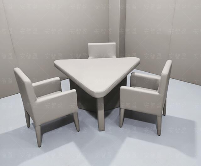 一般一间谈话室的建筑面积为17到35m2,室内包含防撞墙面板,谈话桌椅,全景摄xiang头等,“安智盈”这种防撞三角桌一般是家具板软包制作,板材厚度不小于2.5cm,厚度升级承重有力,桌子更加平稳,经防潮、防虫、防腐处理,抗弯力强,不易变形。独立卫生间以及便捷的回弹防撞床。“安智盈”软包谈话桌全软包防护:安全设计,防撞牢靠。