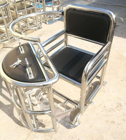 本产品匀选用标号为国*标201优*质不锈钢材料,包括靠背、座面、椅腿、扶手及胸部约束环另外包括座椅前设有整体弧形开关装置。其桌面上方装有U型锁具,方便约束其手腕。椅腿下方装有直接与地面固定底盘。