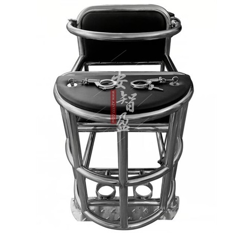 kao,方便约束其手腕。台板下方为笼式框架,与台板成一体,可限制目标人腿部运动范围,腰部有不锈钢约束环。靠背、座板、台板用海绵覆皮革成软包。椅腿下方装有直接与地面固定底盘。