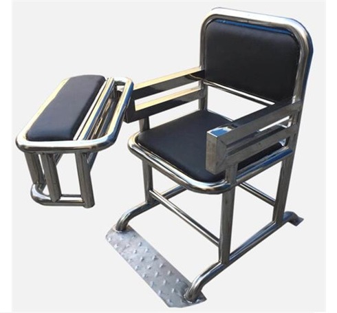 材质: 管壁厚度为贴标2.0mm工业管制成;座面不锈钢板厚度为贴标1.5mm制成;桌面不锈钢板厚度为贴标1.5mm制成;扶手不锈钢管厚度为贴标2.5mm;工业不锈钢管制成;伸缩腿为不锈钢管壁厚度为贴标1.5mm;脚部约束环采用5.0mm工业不锈钢板制成。