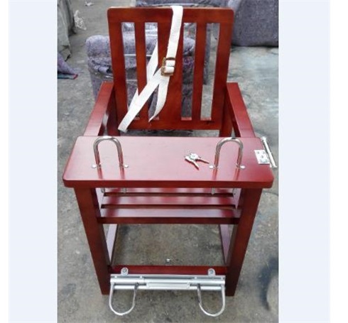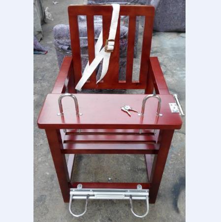 产品特点:上部装有锁具,打开时需用钥匙,钥匙通用,下部不用钥匙,锁具中间有拉杆控制两端锁环,操作极简单,双脚绝对不会从锁环拔出,所装锁具及钥匙为定制,此椅相对同类产品重量重,用料大,结构好,更为适用。(靠背上端两角及前方木板已改为圆角)