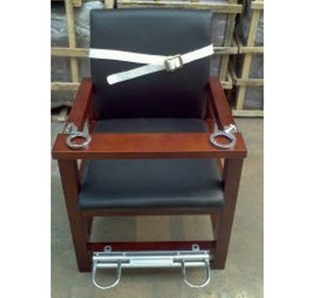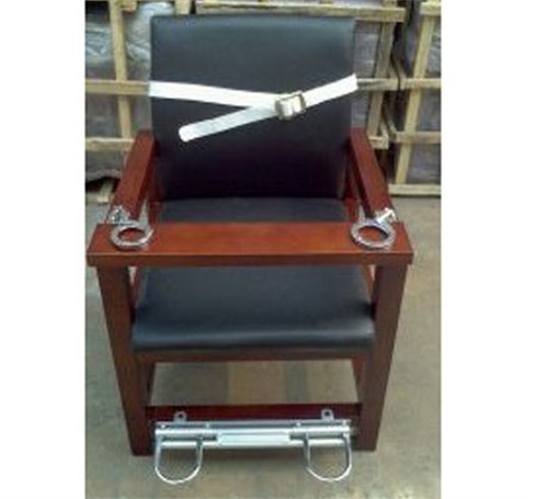 座位部及靠背软包处理,两边扶手(主料)上固定有不锈钢手*铐,前方装有签字板,前下方装有脚锁,锁具中间有拉杆控制两端锁环,双脚绝对不会从锁环拔出,脚锁操作简单牢固,椅子四腿部有膨胀丝固定片,靠背装有绑定上身的安*全带,防止前倾自残。