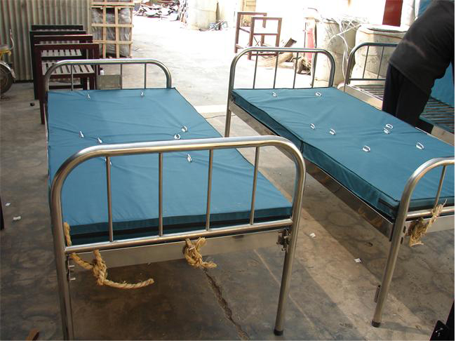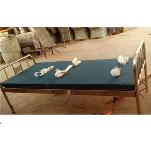扣带约束床,不锈钢材料制作,也可普通钢材喷塑处理,床面颜色有白色和黑绿色,手脚均可固定,上半身和腿部可调节角度,既舒服又不易逃脱。 带式床可固定四处,即:手部,脚部,腰部和xiong部。手动起身功能:通过手柄操作背部可以升降。