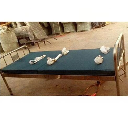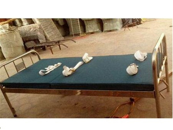 扣带约束床,不锈钢材料制作,也可普通钢材喷塑处理,床面颜色有白色和黑绿色,手脚均可固定,上半身和腿部可调节角度,既舒服又不易逃脱。 带式床可固定四处,即:手部,脚部,腰部和胸部。手动起身功能:通过手柄操作背部可以升降。