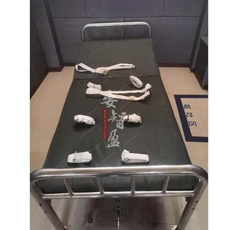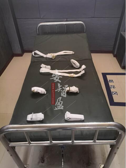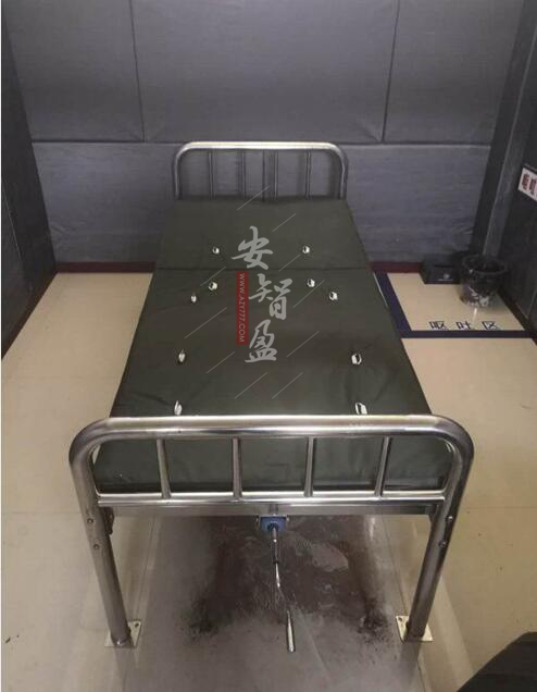 扣带约束床,不锈钢材料制作,手脚均可固定,上半身和腿部可调节角度,设计比较人性化,既舒服又不易逃脱。 床体采用高频型焊接成型,结构合理、坚固耐用。扣带式床上面有约束带可固定四处,即:手部,脚部,腰部和胸部。手动起身功能:通过手柄操作背部可以升降。