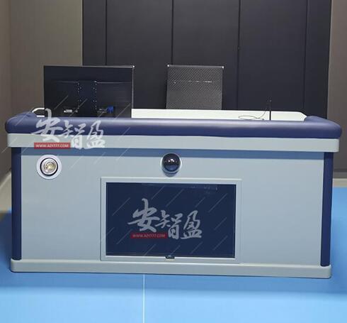 采用高密度板贴实木皮,平整光滑,手感视觉效果好,满足现代审讯家具需求,桌子四周均采用软包棱角制作,以防犯罪人员撞击。