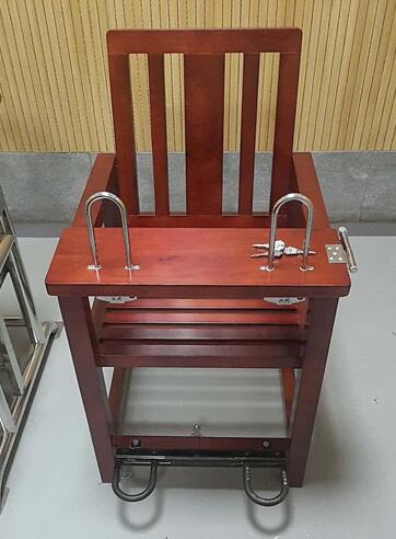 小锁,木制审讯椅(仅木板下有一小锁),橡木制作(靠背上端两角及前方木板已改为圆角),脚部留有膨胀丝孔,可固定于地面,发货时多层包装,能保证安*全到达,常有现货