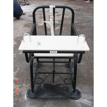 步骤如下:1.站到椅子右边,用左手扮开右后方弹性带孔扁钢(水平状态),同时右手推开前方活动部位,此时左手暂时放开。2.被审讯人员入坐,脚放到花纹钢板上,工作人员用右手将活动门关闭,同时左手再次掰开弹性带孔扁钢(水平状态),将前方活动门卡住。3.固定手部:用钥匙打开锁具,将其手部锁住,不可太紧。4.开始准备固定脚部,工作人员用右手轻掰弹性带孔扁钢(不可掰到水平,否则前方会打开),同时再用左手或左脚将后面控制杆压至最低,此时前方被审讯人员脚部放入铁环中央,慢慢升起后方控制杆,松开右手扁钢至卡住状态,到此被审讯人员已经无法逃脱.5.为防止自残,将上方安*全带固定至上身,使其上身不能前倾,保护头部.6.使用后检查椅子上的螺丝是否松动等,为下次使用做好an全准备