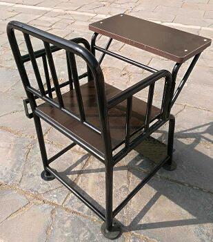 此审讯椅靠背高度为1030mm,宽为590mm,椅腿长为750mm,小桌长:500mm ,小桌宽:280mm,地面离座面高:550mm ,座面至背面高:500mm。
