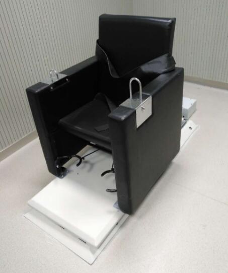 审讯椅手部采用U型锁约束,U型锁下按至合适位置将嫌疑人手部锁住,扶手部位宽度便于签字书写;xiong部及腰部以约束带束缚;腿部以环形脚踏锁,jing员在椅后用脚踏可将锁打开,嫌疑人小腿置入,踩踏锁上,操作方便。