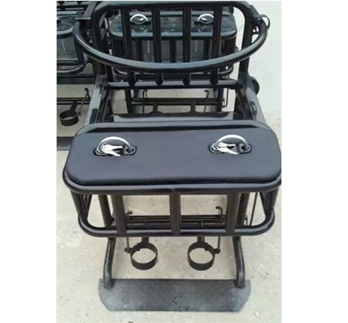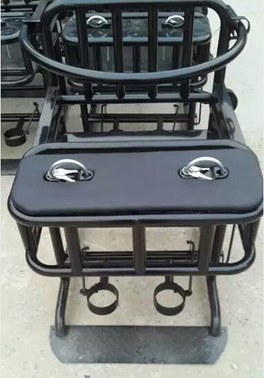 座位处及锁手处面板为加厚钢板,锁具为钥匙型,钥匙通用(特制),椅子后部有弹簧开关,掰动开关脚部锁具自动打开,使用中无需配备其它任何锁具,靠背有胸带。